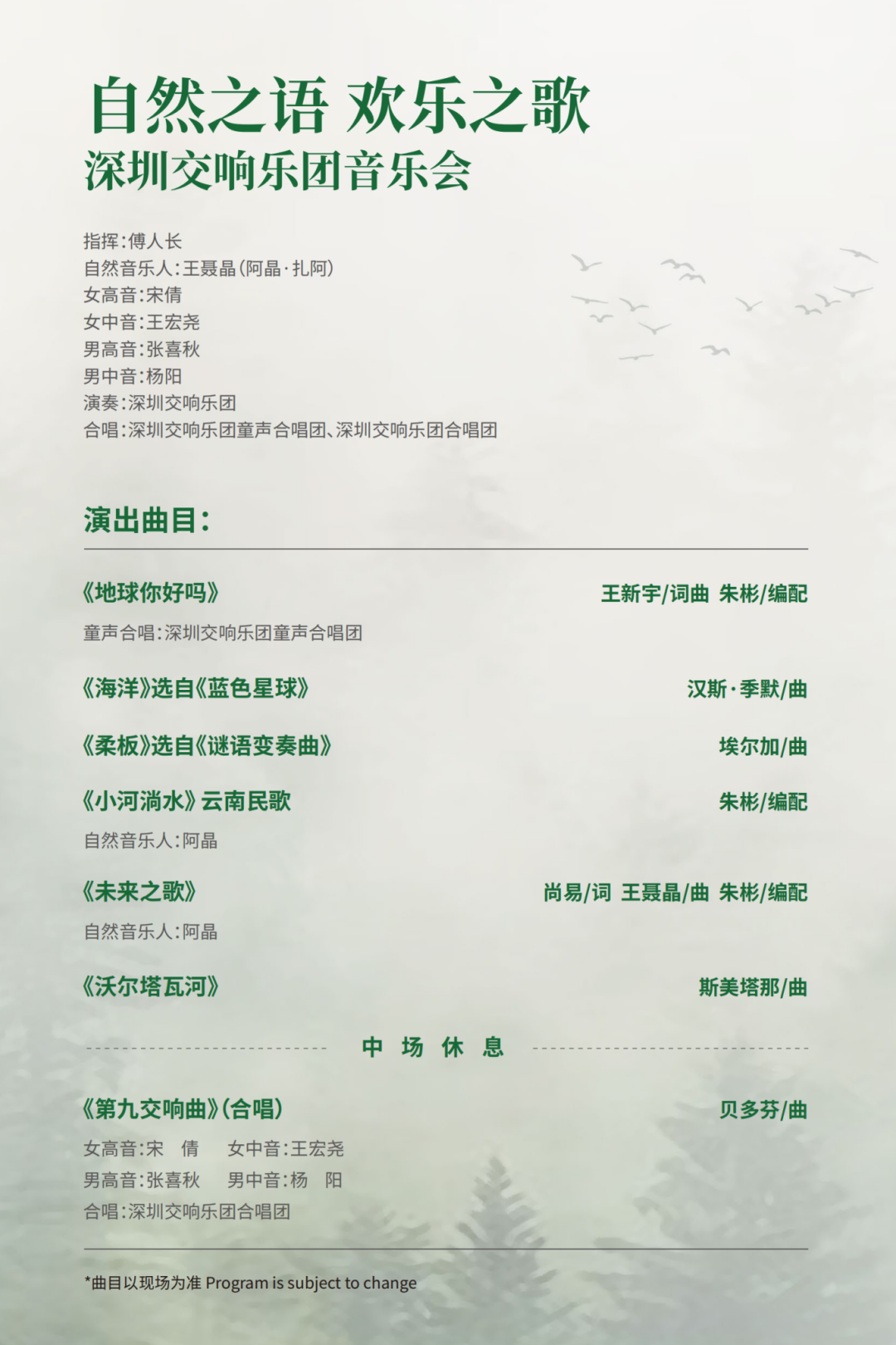 自然之語 歡樂之歌——深圳交響樂團音樂會以“人與自然、和諧共生、贊頌自由、謳歌歡樂”為主基調,選取國內外著名的經典交響樂曲目,融合獨唱合唱等唱段深發主題意蘊、渲染情境,以交響樂演奏抒發情感,營造耳目一新的聽覺盛宴。
