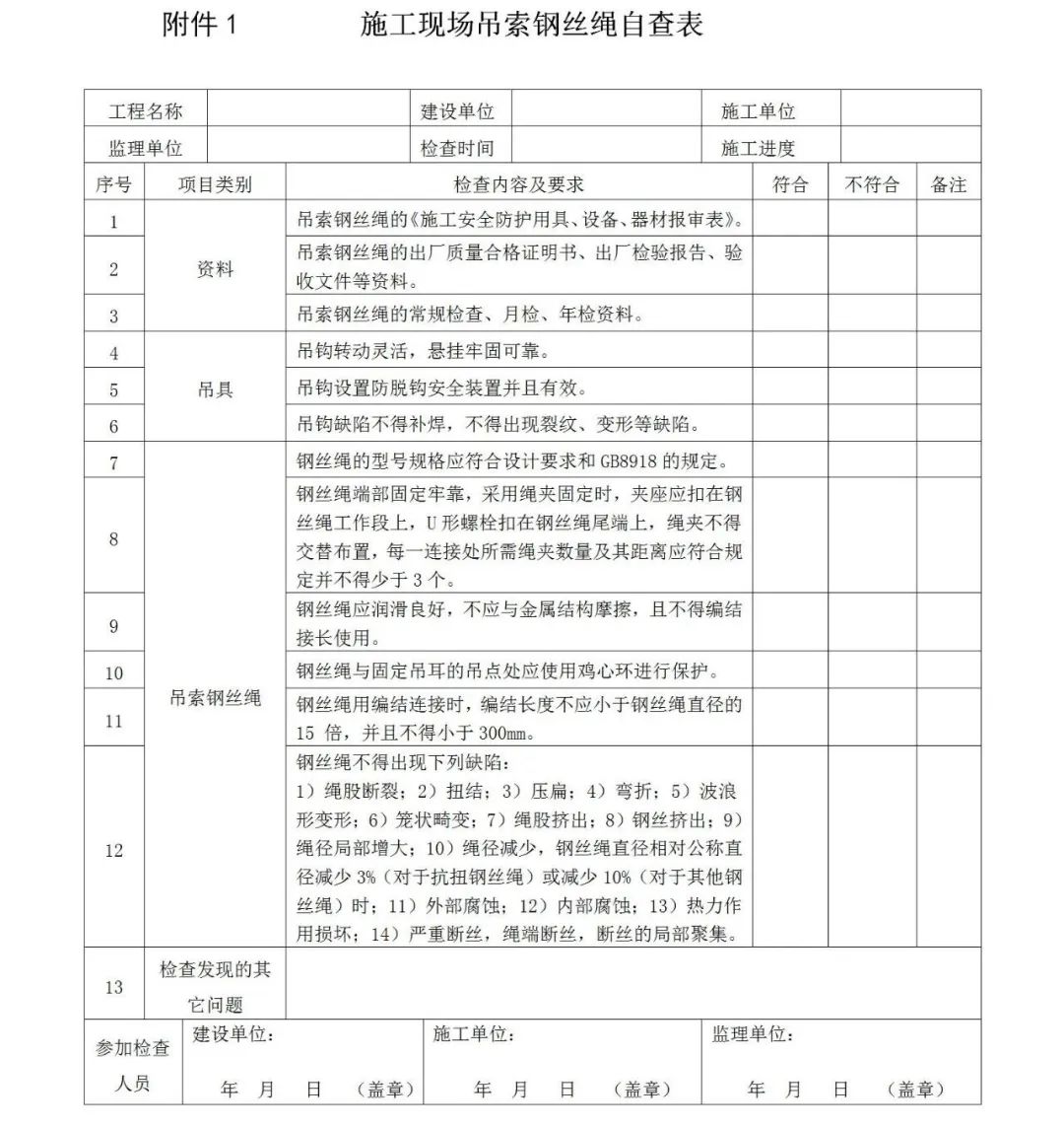 全面排查起重設(shè)備、吊索安全狀況,核查料斗配備以及散料吊裝情況,并填寫《施工現(xiàn)場吊索鋼絲繩自查表》(附件 1)備查。對于施工現(xiàn)場存在使用非專業(yè)起重機(jī)械進(jìn)行吊裝作業(yè)的,監(jiān)理單位應(yīng)立即制止并責(zé)令改正。