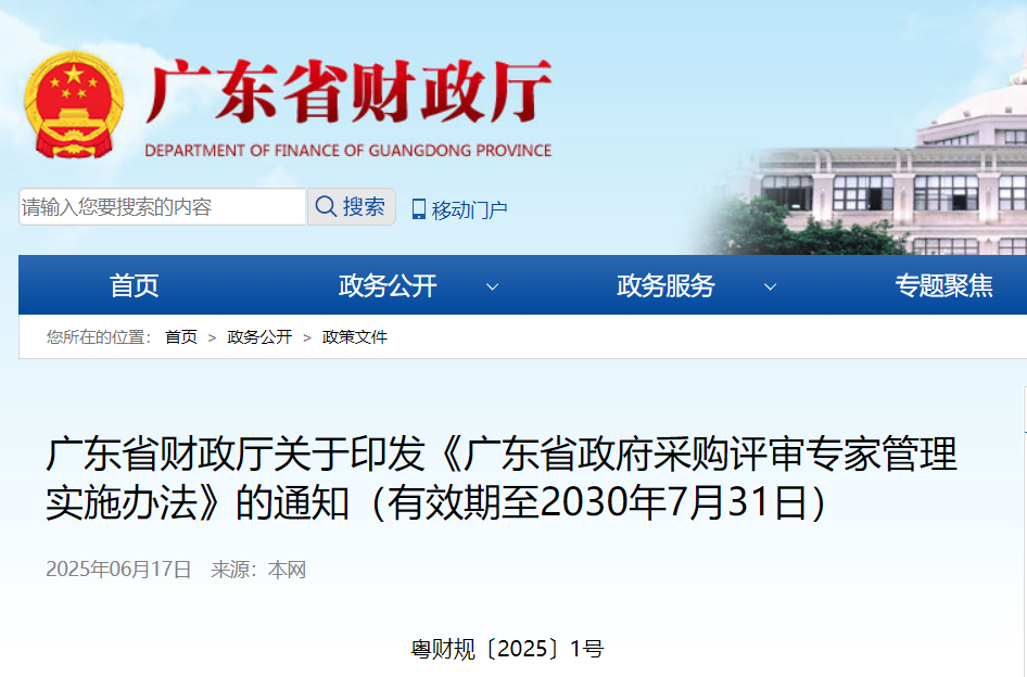 近日,廣東省財政廳發布關于印發《廣東省政府采購評審專家管理實施辦法》的通知(粵財規〔2025〕1號)。