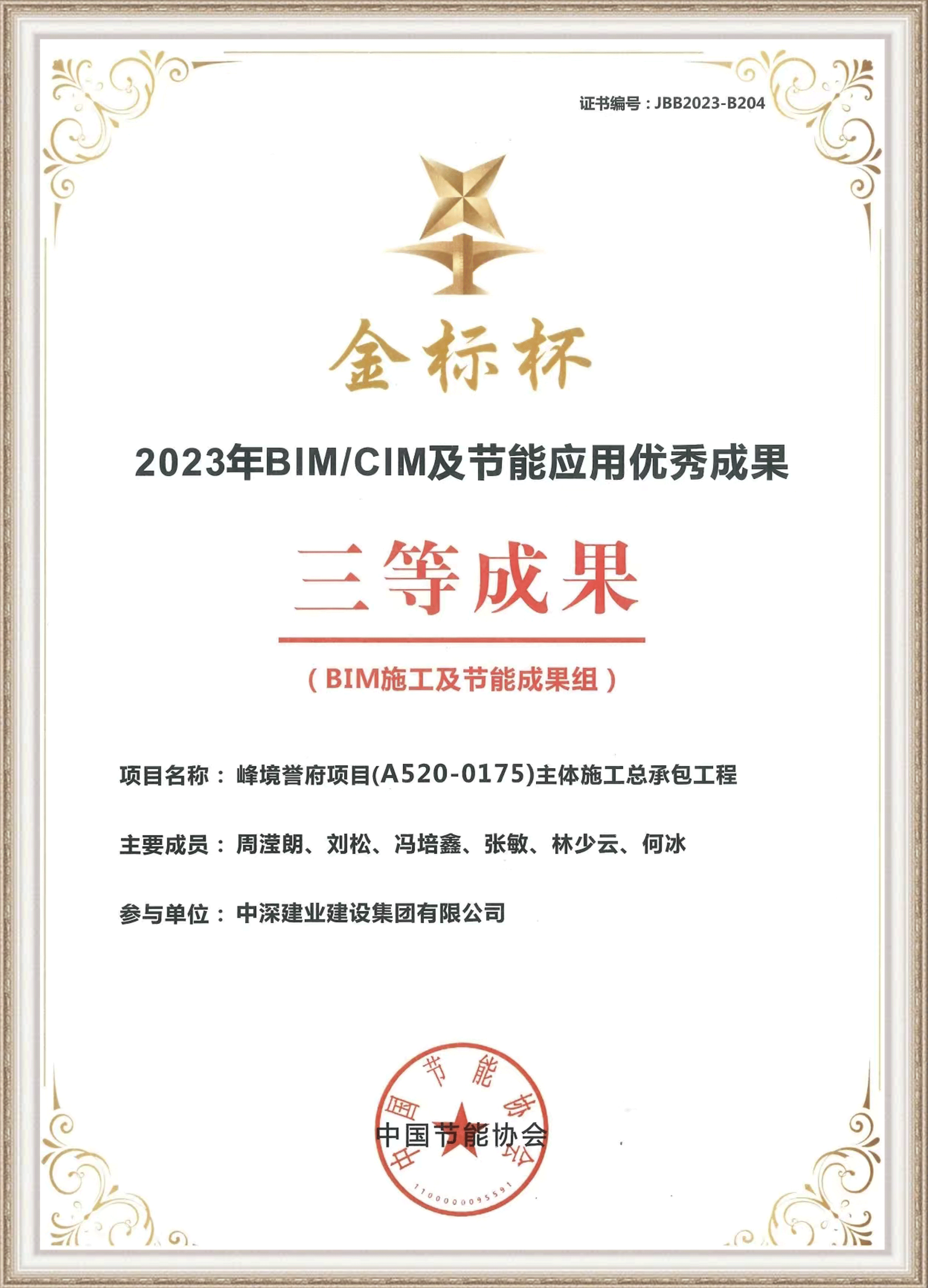 2023年BIM/CIM及節(jié)能應用優(yōu)秀成果三等成果(金標杯)——峰鏡譽府項目(A520-0175)主體工程