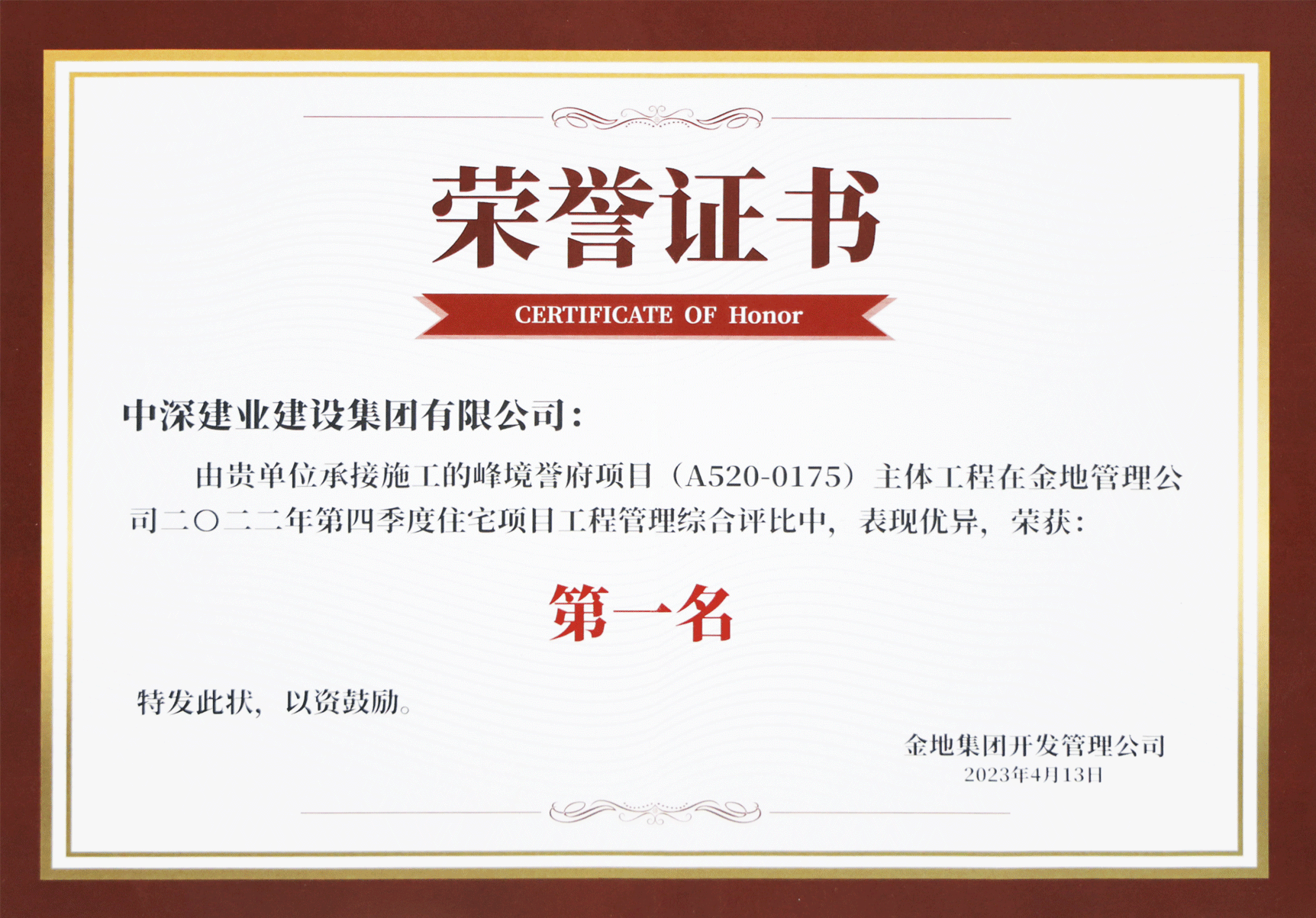 2022年第四季度住宅項日工程管理綜合評比第一名——峰鏡譽府項目(A520-0175)主體工程