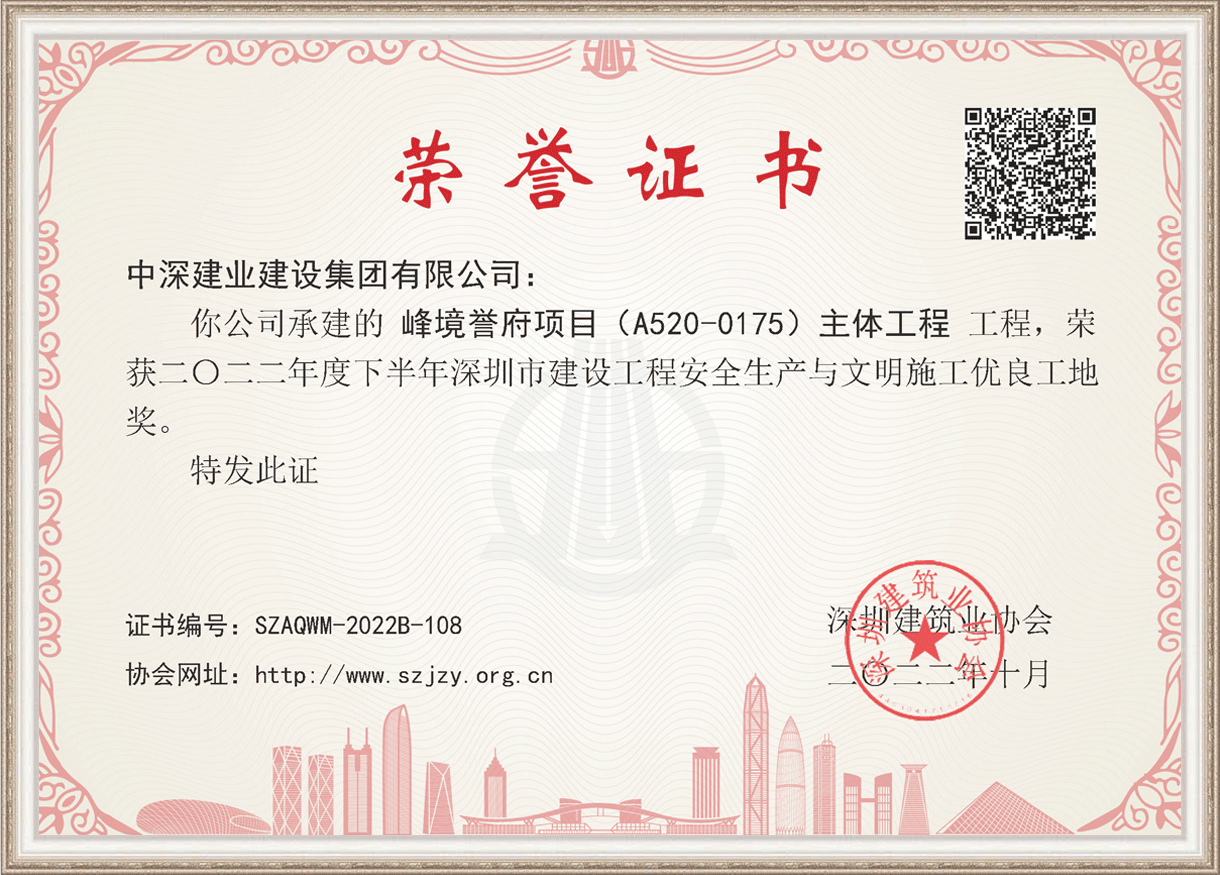 2022年度下半年深圳市建設(shè)工程安全生產(chǎn)與文明施工優(yōu)良工地獎(jiǎng)——峰境譽(yù)府項(xiàng)目(A520-0175)主體工程