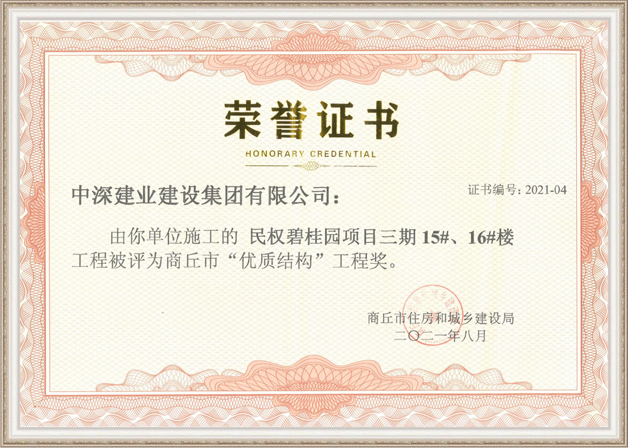 2021年度商丘市“優質結構”工程獎——民權碧桂園項目三期 15#、16#樓工程