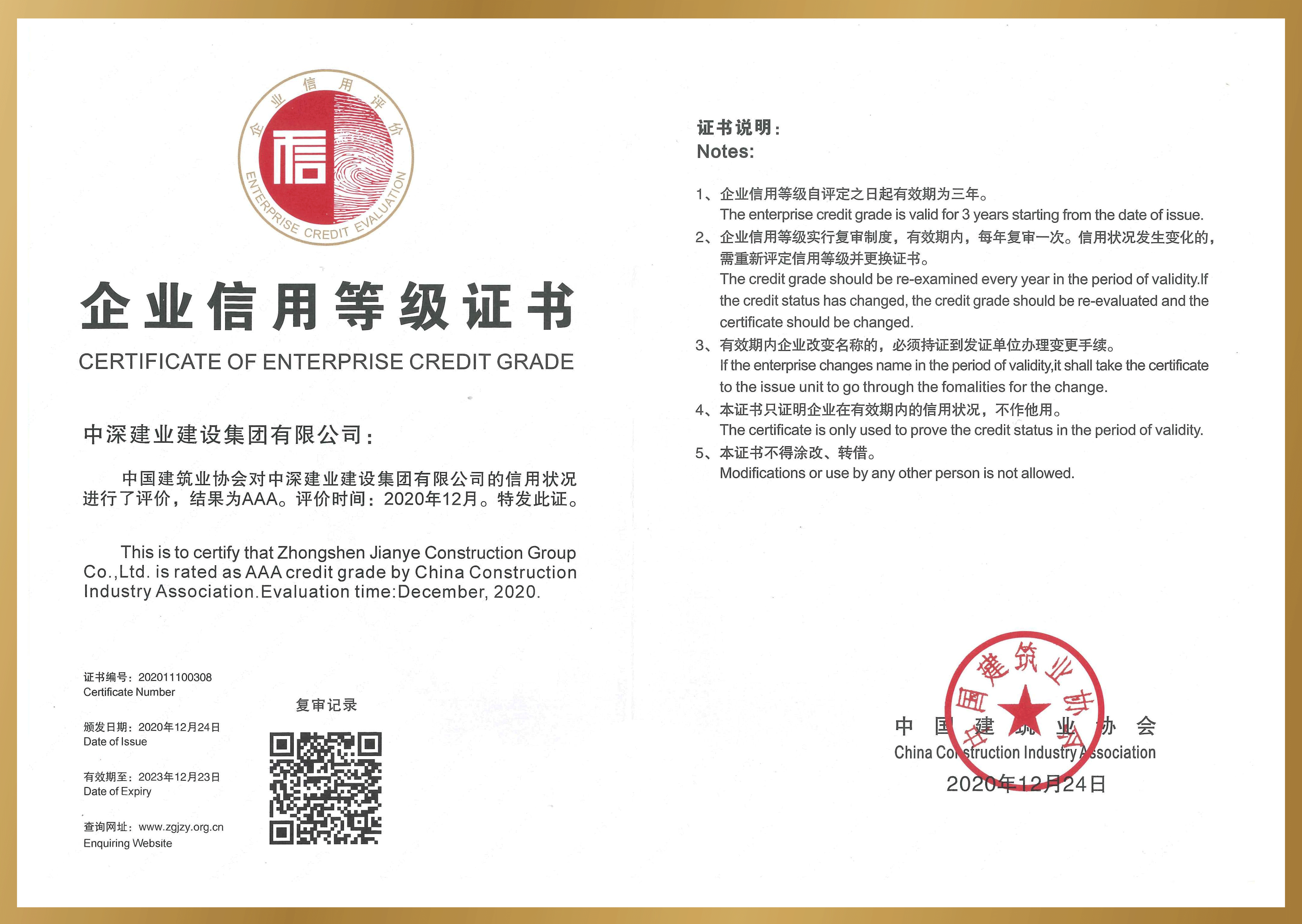 2020年度企業信用等級AAA——中國建筑業協會認證
